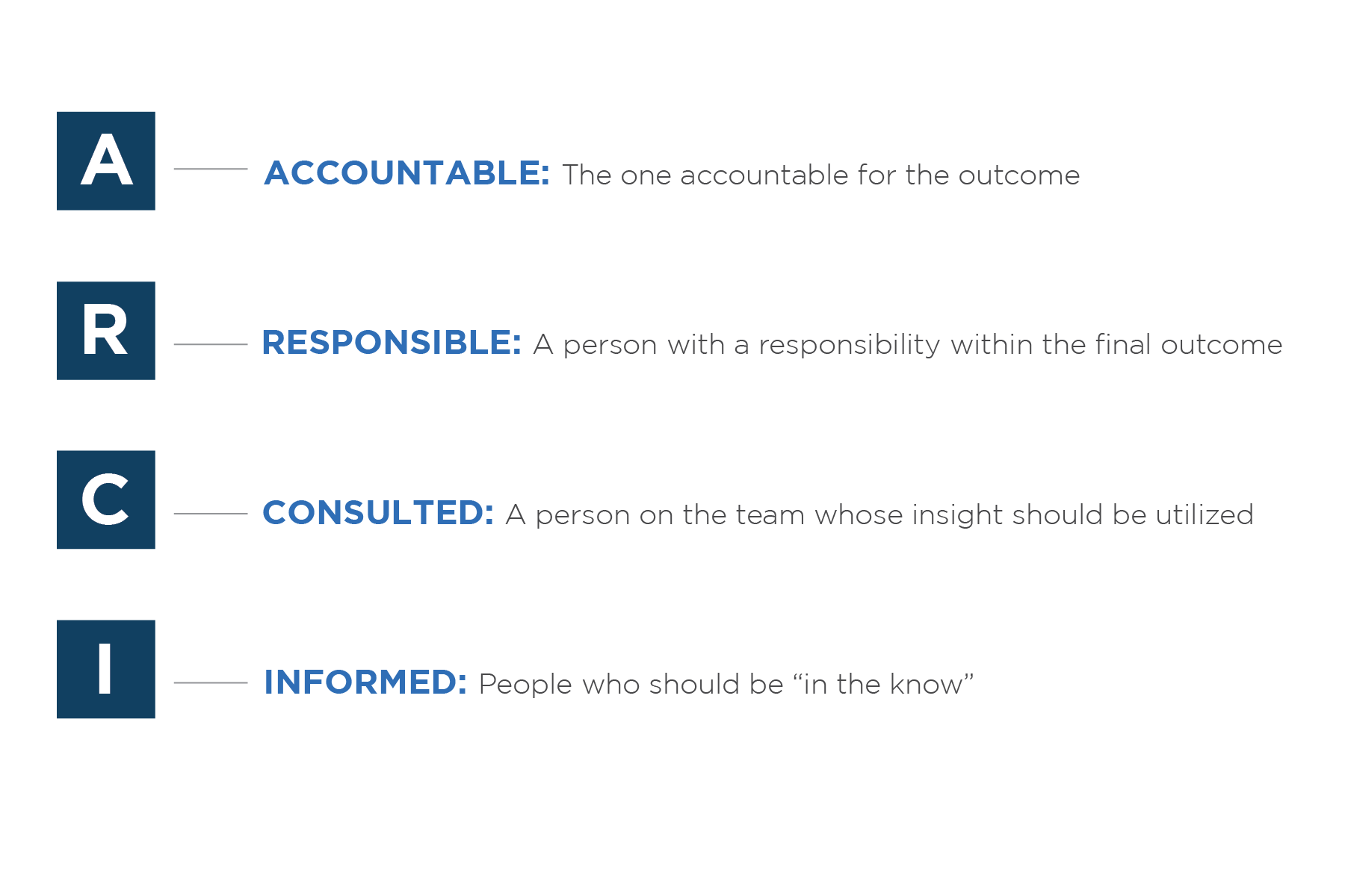- Ensure people are included: Only one person can have the “A,” but there are people with experience, insight, and expertise that need to be consulted. This framework helps ensure they are included.